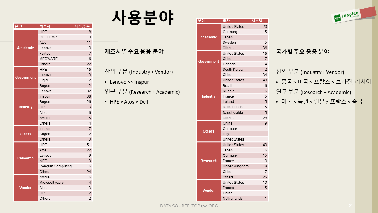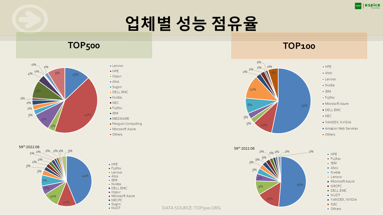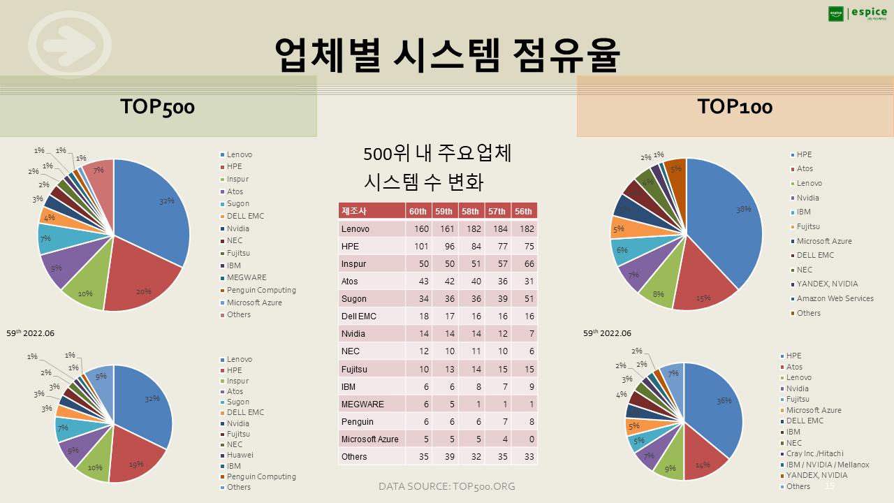 비교적 작은 시스템을 많이 하는 것으로 보이는 Lenovo와 대형 시스템을 많이 하는 HPE가 전체 시장의 절반을 차지하고요, 중국 기반의 회사가 전체의 1/4, 나머지 부분이 Atos와 Dell 순서대로 점유하고 있네요.