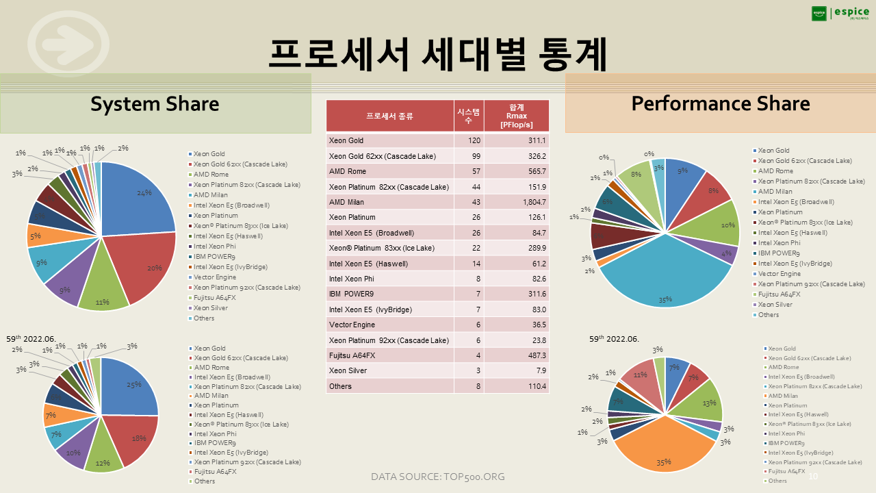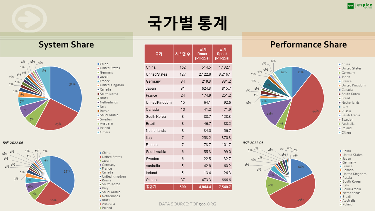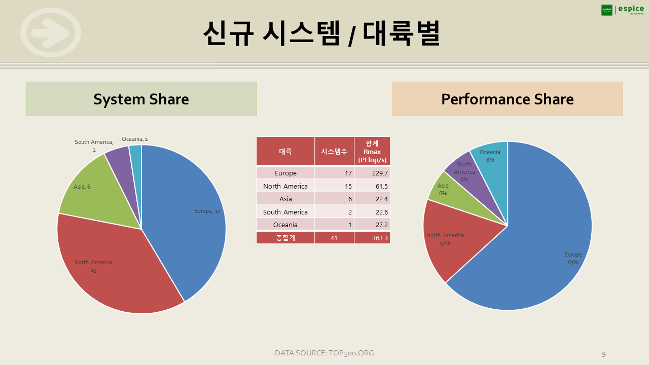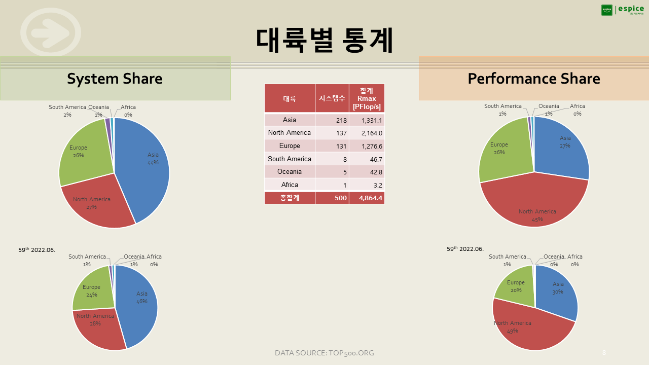 대륙으로 보면 중국, 일본, 한국의 아시아가 시스템 수는 많지만, 대형 시스템이 많은 북미에 성능 점유율이 높네요.