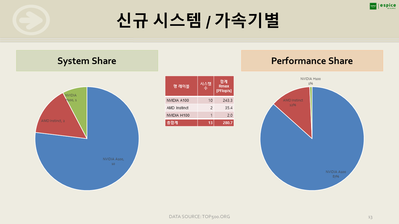 가속기를 탑재한 신규 시스템도 여전히 A100이 많긴 합니다.