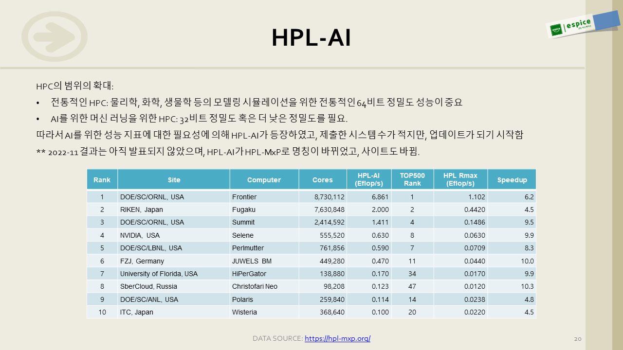 이를 위해 HPL-AI라는 것이 등장했는데, 명칭이 이번에 HPL-MxP로 바뀌었네요. 아직 최신 정보가 취합이 안 되었는지 2022-11 결과는 업데이트되지 않았습니다.