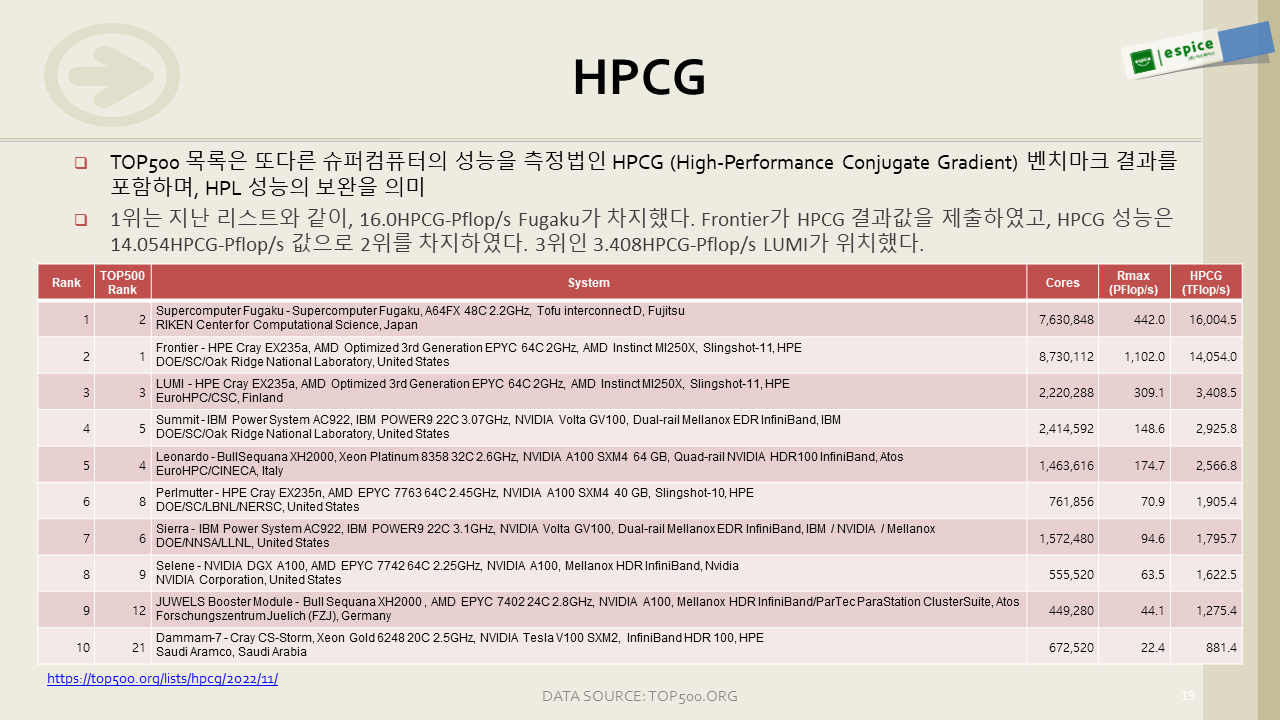현재 TOP500 1위 시스템인 Frontier가 지난 회차에서는 HPCG값이 없었는데, 이번에 등록했는데 2위입니다. 아직 최적화가 안 된 것 같아요.