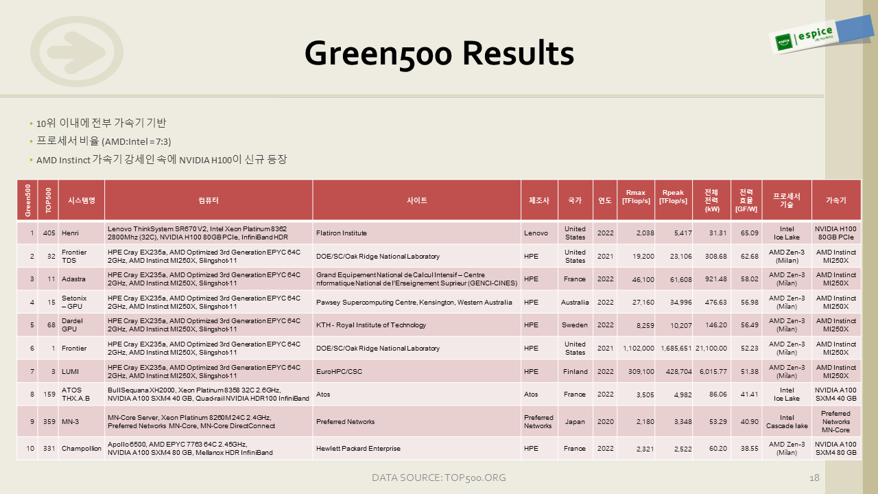 지난 회차에서 AMD MI250X가 등장하면서 소비 전력 대비 성능 면에서 휩쓸었는데, 단 1대 등재된 H100이 AMD MI250X 돌풍을 한 방에 잠재웠습니다. 아직 1대 밖에 안 되어서 충분히 믿을 만한 값인지는 알기 어렵지만, 일단 다음 순위를 기대하게 하는 부분 중 하나입니다.