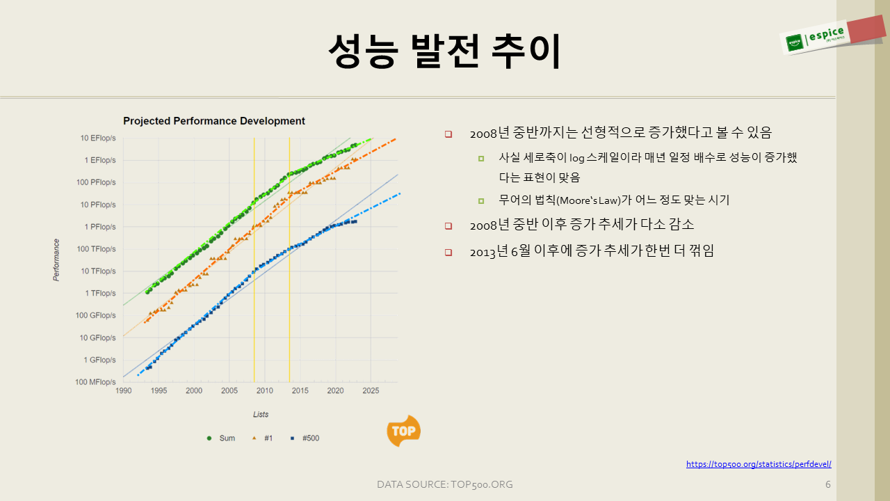 TOP500 내의 시스템들 성능의 추이를 먼저 보죠.