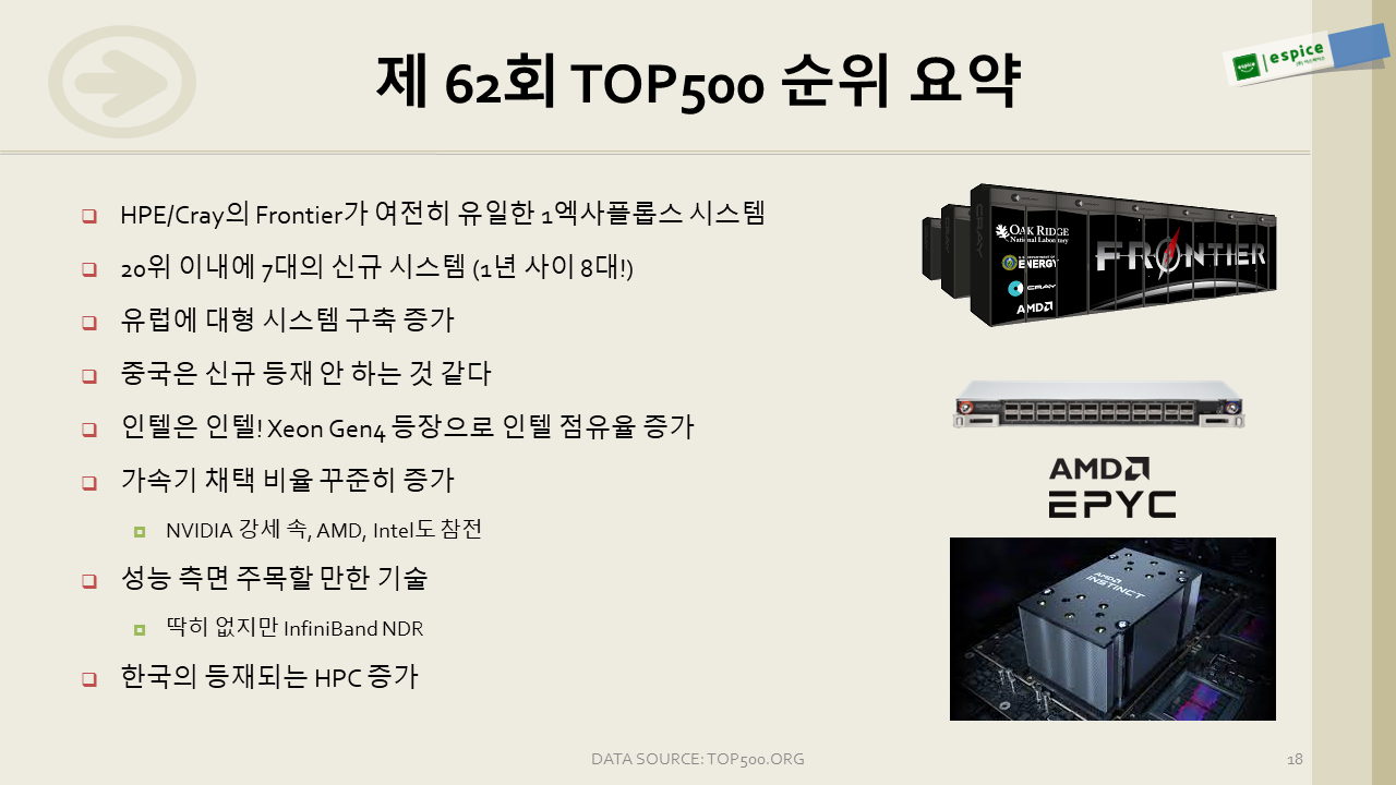 기술적으로는 아주 새로운 것은 없습니다. 다만, 인텔 Xeon 4세대가 등장하면서, AMD에 빼앗긴 점유율을 조금 회복하고 있는 모습입니다. 가속기 부문은 NVIDIA 독주 속에 AMD와 인텔의 가속기가 초대형 시스템 구축에 적용되면서 상당한 성능을 과시하고 있습니다.