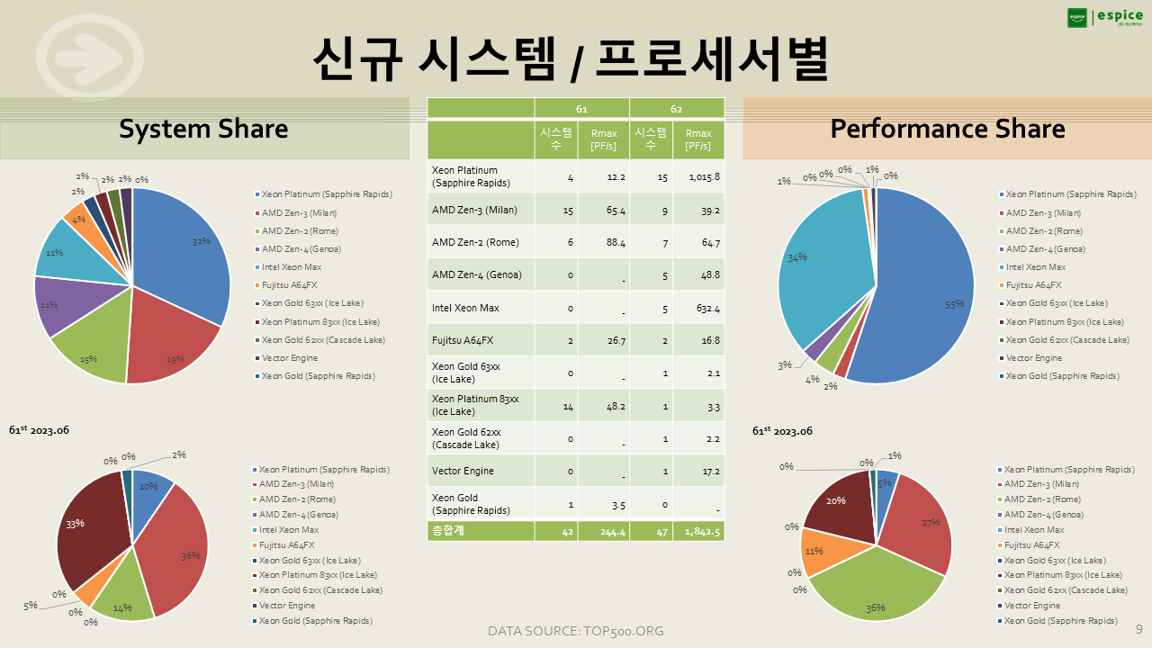 지난 회차(61회)까지는 AMD EPYC 3세대가 많았지만, 이번 회차에서 확실이 인텔 4세대 Xeon이 많습니다. 정말 오래간만에 인텔의 강세를 보네요.