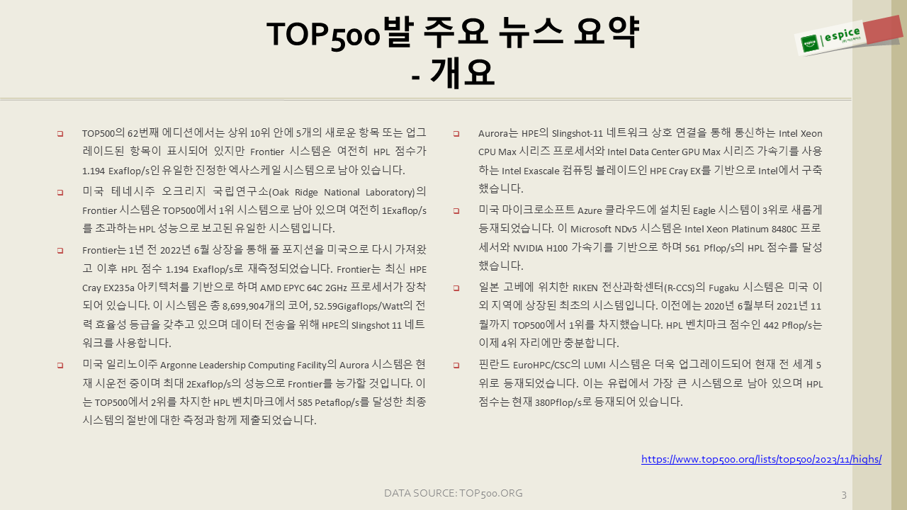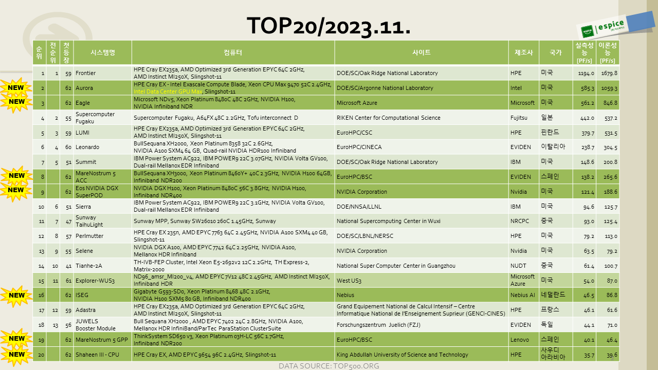 매년 2회 발표하는 TOP500 수퍼컴퓨터 랭킹이 올해 11월에도 어김없이 발표되었습니다.