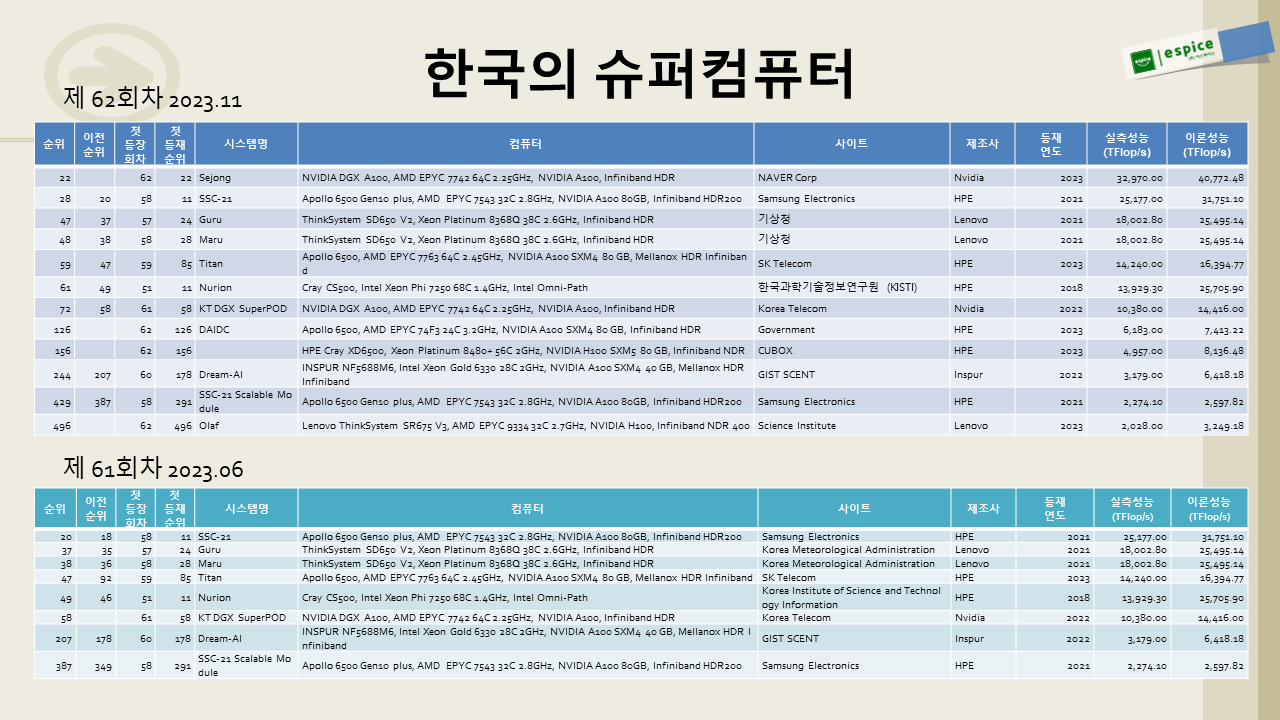 이 정도가 2023년 11월에 공개된 TOP500 수퍼컴퓨터 랭킹으로 알아본 내용입니다. 데이터가 증가하고, 그 데이터의 처리에 더 많은 컴퓨팅 자원이 필요하기에 수퍼컴의 활용은 계속 증가할 것입니다. (주)이스파이스와 함께 지켜 보시죠.