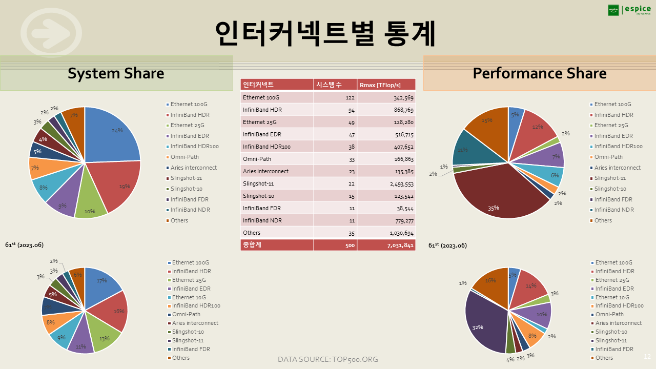 전통적인 이더넷도 속도가 많이 빨라져서 Ethernet 100G로 구축하는 시스템도 많아졌습니다. 하지만, 지연 속도가 절대적으로 낮은 인피니밴드가 여전히 성능쪽에선 많은 부분을 차지합니다. 특히나 200G 이상인 HDR (200G), NDR (400G)가 점차 많아지고 있는 추세입니다. AMD는 이미 빨랐지만, 인텔의 PCI Express 속도가 빨라짐에 따라 조금 더 인피니밴드의 속도 가속화도 빨라지는 것 같습니다. HPE/Cray의 자체 고속 네트워크 인터페이스인 Slingshot은 원체 대형 시스템에 많이 채택되다 보니 성능 점유가 높습니다.