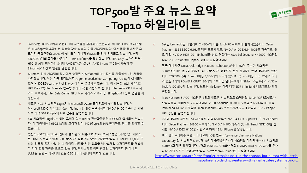 TOP500측에서 언급한 주요 뉴스는 다음과 같습니다.